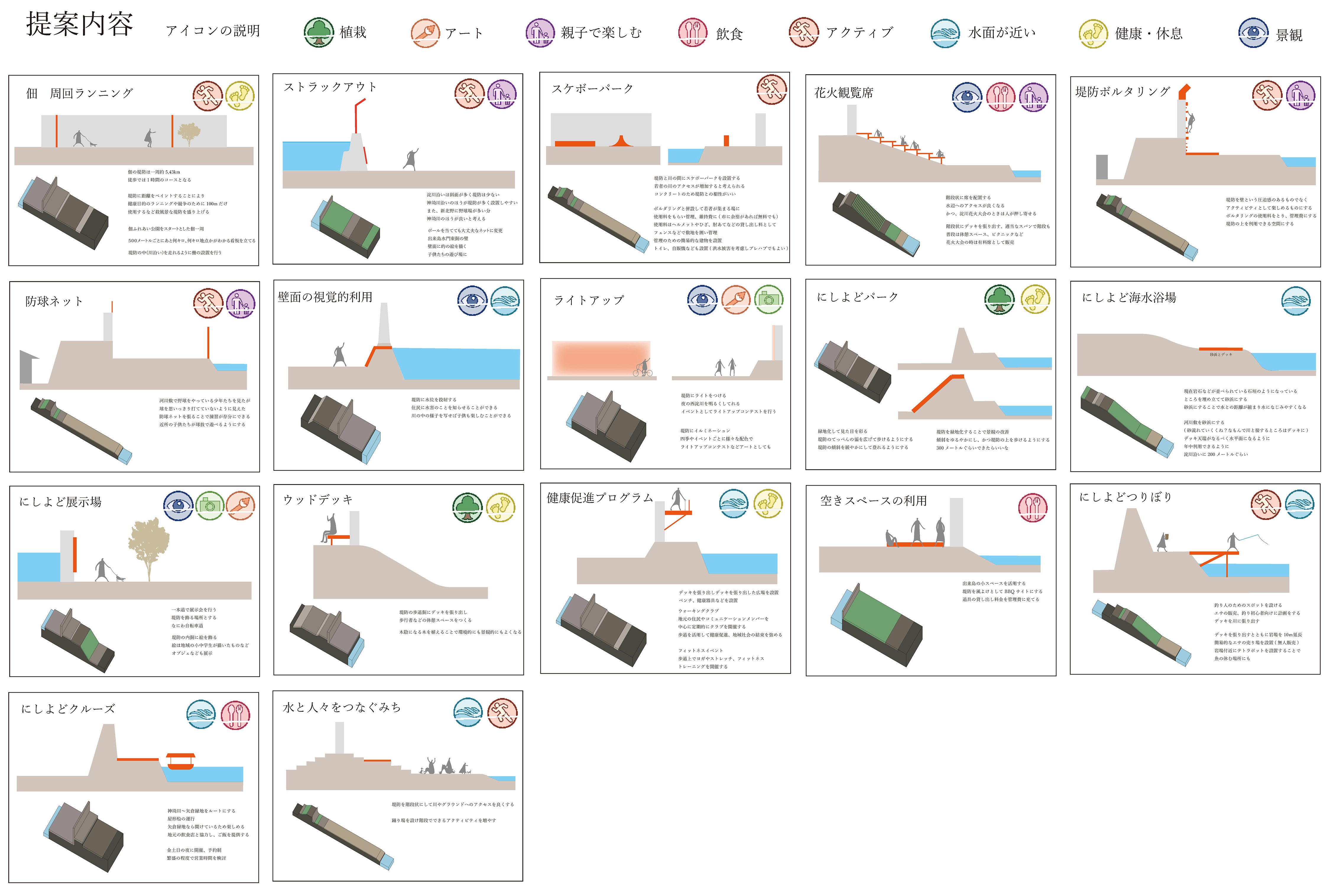 その上で,場所の特性に応じた親水空間17案を考案した。