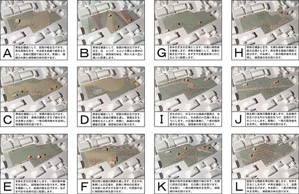 アンケート調査や現地調査の結果をふまえ,防災公園の計画・設計・管理運営ガイドラインや,熊本地震時の公園利用実態調査の結果を参考に,第1段階模型を12案(A~L案)制作した。意見交換会でプレゼンテーションを行い,参加者による模型案への投票を行った。投票は,模型案の絞込みのためではなく,票の偏りやばらつき具合と,各案に出された意見より,重要と思われる空間の機能や形態を抽出し,次段階の模型に活かすために行った。当日参加できなかった方々の意見も収集できるよう,各自治会に資料を配付し投票頂いた。