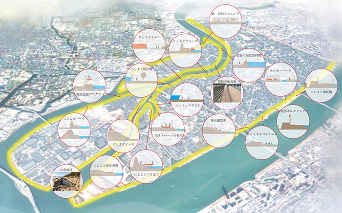 以下の俯瞰図は,西淀川区の水辺全域(黄色の帯)を示している。既存の佃防災船着場と矢倉緑地に加えて,これら17案の親水空間のいずれかが適応され得ると考える。