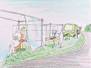 内湖が干拓された土地に,3Dプリンターで住宅を建設し,新たな街を成す。